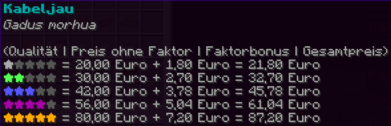Jeder Fisch kann eine Selteheit von 1 bis 5 Sternen besitzen. Der Preis der Fische berechnet sich wie folgt: